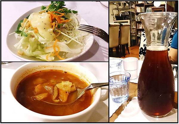 蕃茄湯的蔬菜和菇類燉得軟爛,友人一口氣喝了好幾碗。
