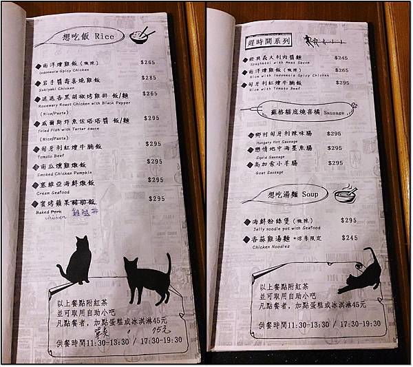 正餐依種類分為三頁,大致上是麵、飯、香腸和湯麵系列,餐點都有附紅茶。