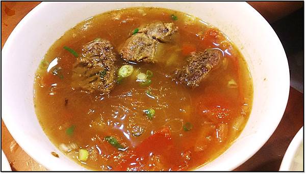 整體而言跟牛肉麵相當類似,主要的差別就在於加了新鮮番茄切塊的泛紅湯頭。